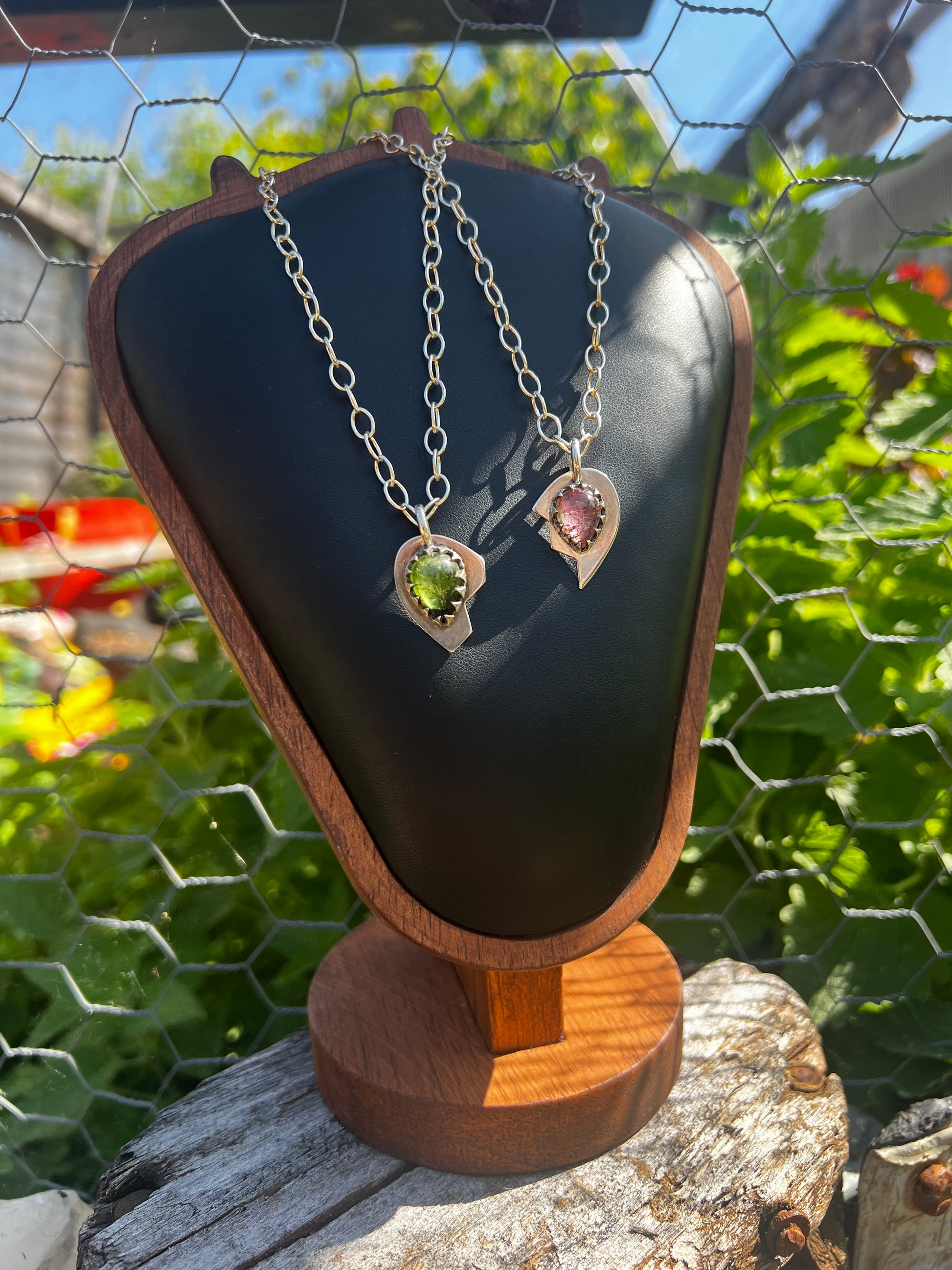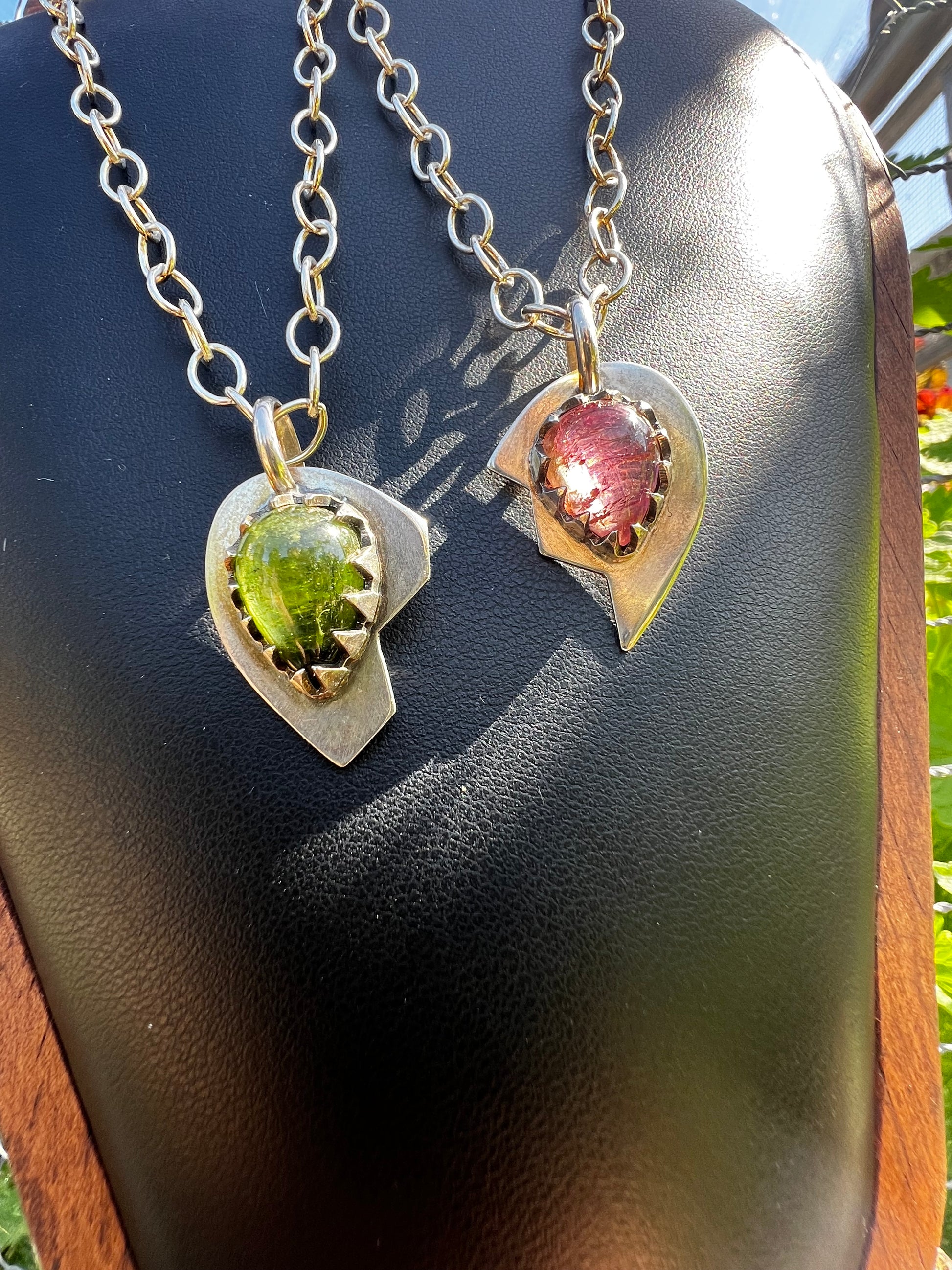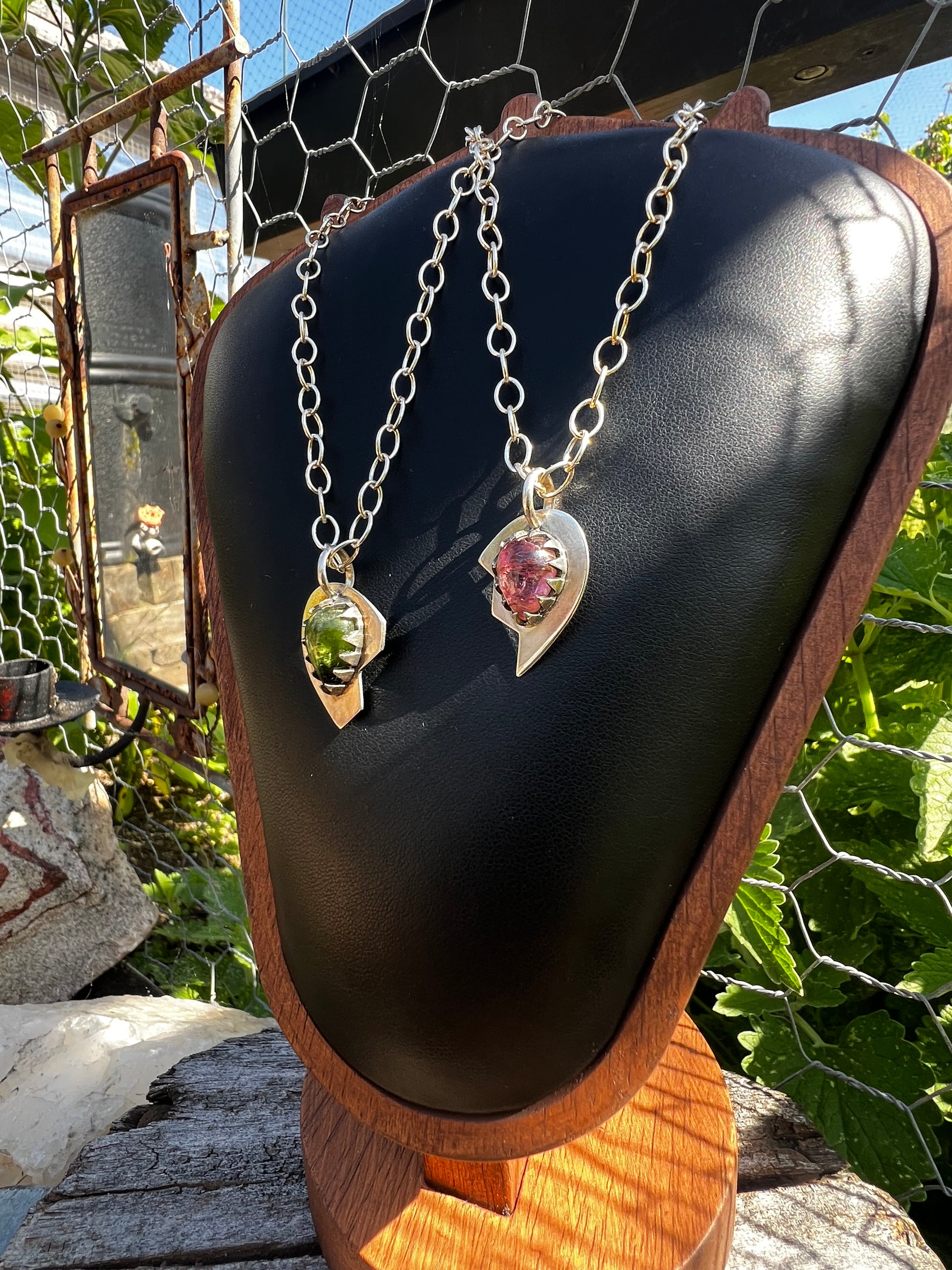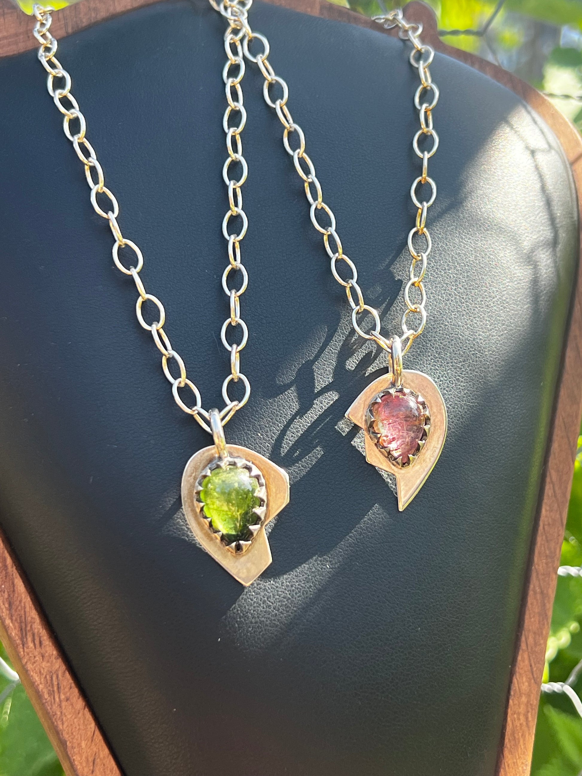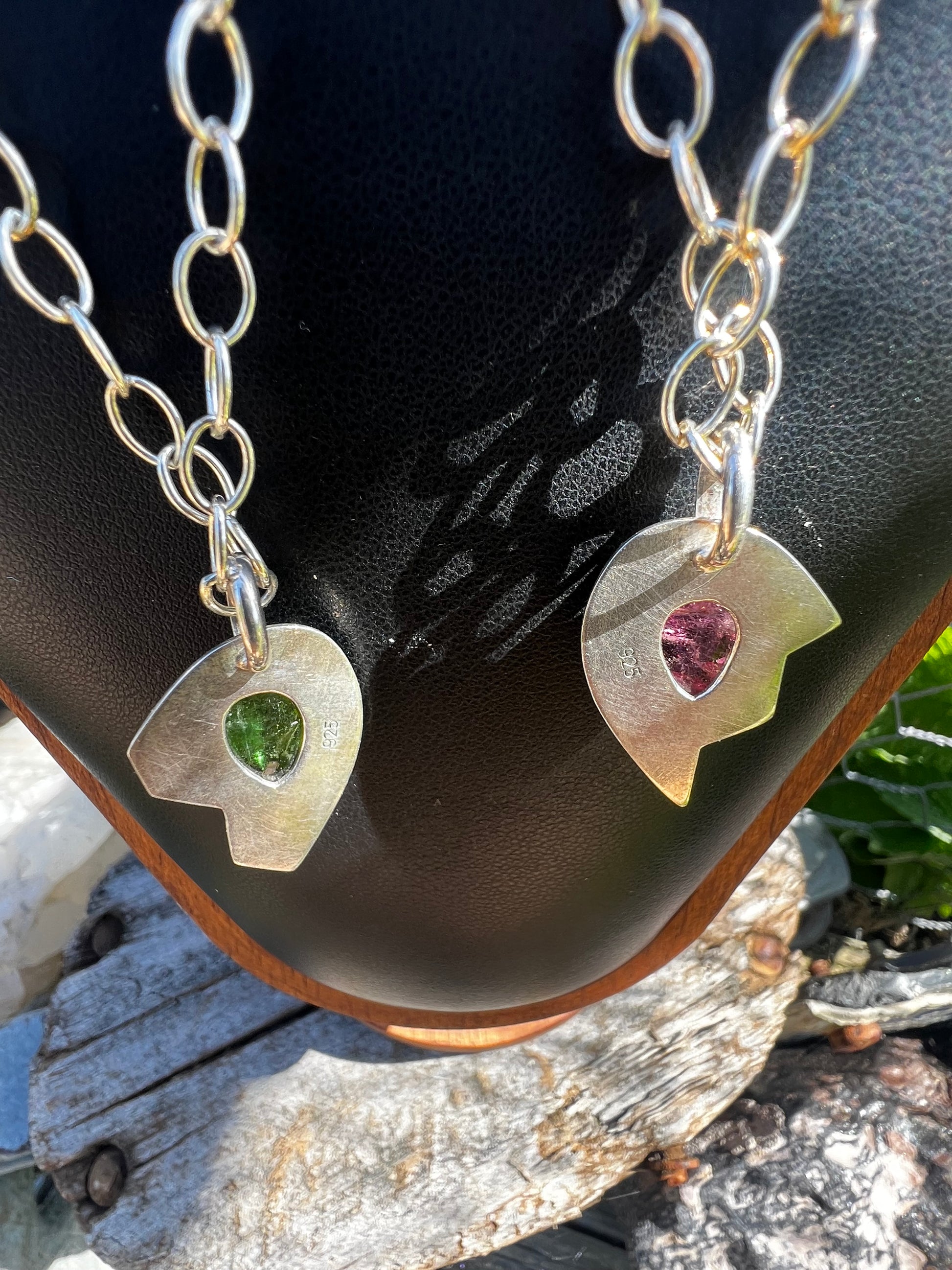 A throwback into iconic era’s, this hand fabricated solid silver necklace set was inspired by relationships in nature. Best Friends.  So similar but so different, the  green and pink Tourmaline gemstones were the muse to this design collab.  Which one are you?
